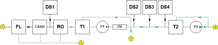 | 1 - подключение исходной воды | Т1 - накопительная емкость обессоленной воды |